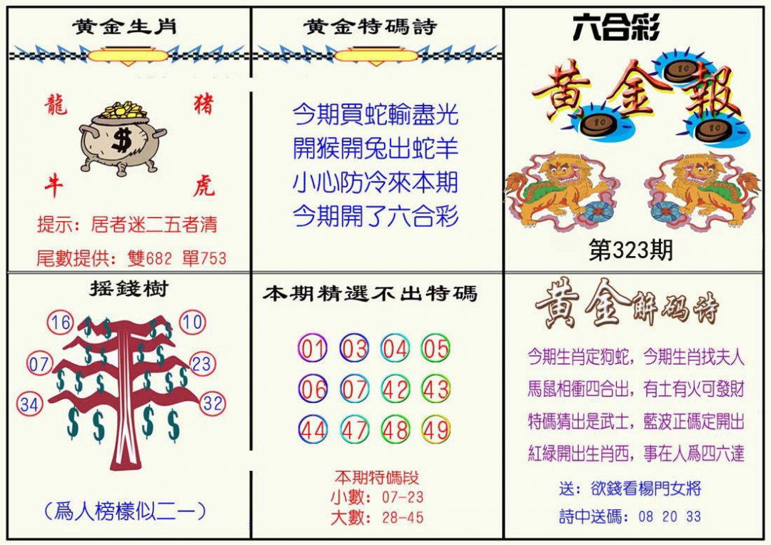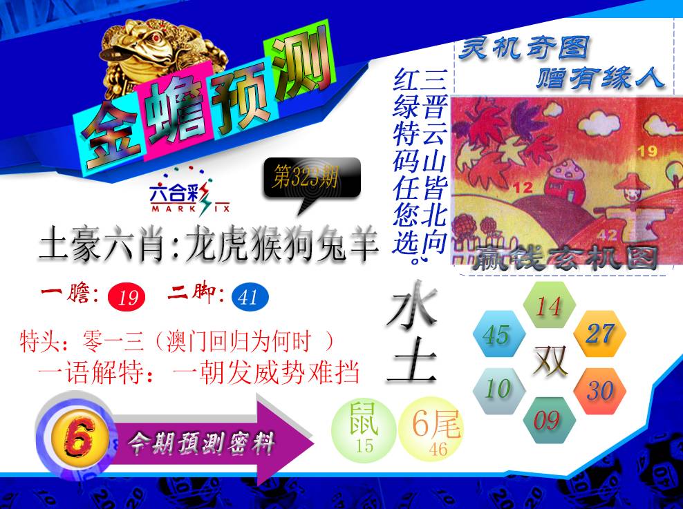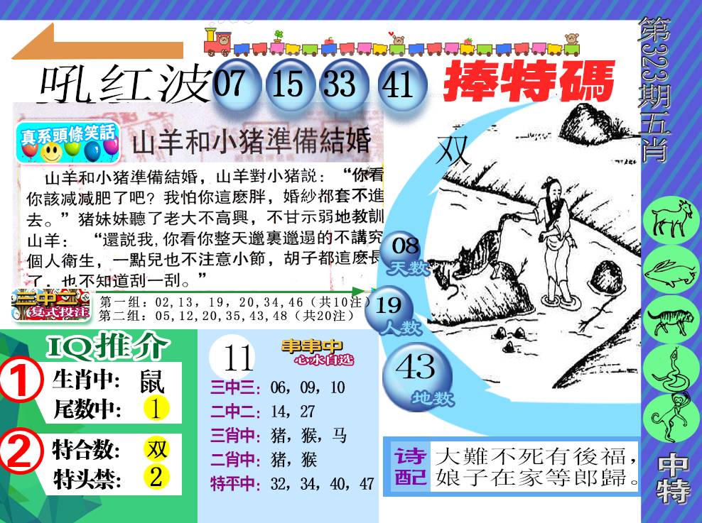 323期正版天机诗 一九加三得二特 。送:鼠虎牛猴猪。 推荐:0 3 1头+蓝红波(开?00) |